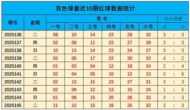 上期红球大小比为3:3,近10期大小比为25:35;总体上小奖号走势稍热,本期柔软大数较上期走势保执,推选大小比为:3:3